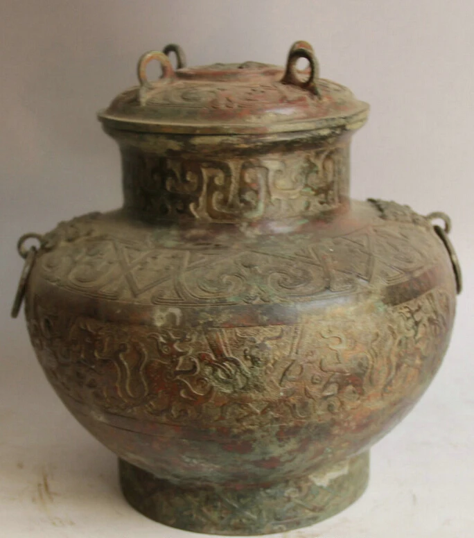 BEST QUALITY S2303 12" Old China Bronze circular Beast food water Wine vessel Pot Jar Crock kettle D0318